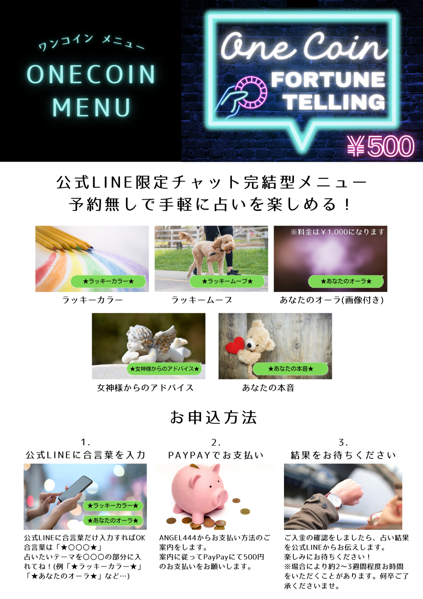 ワンコイン(¥500)で楽しめるプチ占いのため、